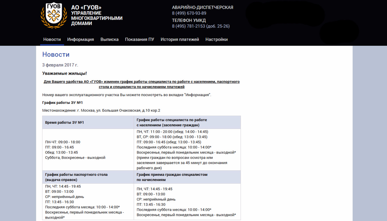 Для Вашего удобства АО «ГУОВ» изменен график работы специалиста по работе с населением, паспортного стола и специалиста по начислениям платежей