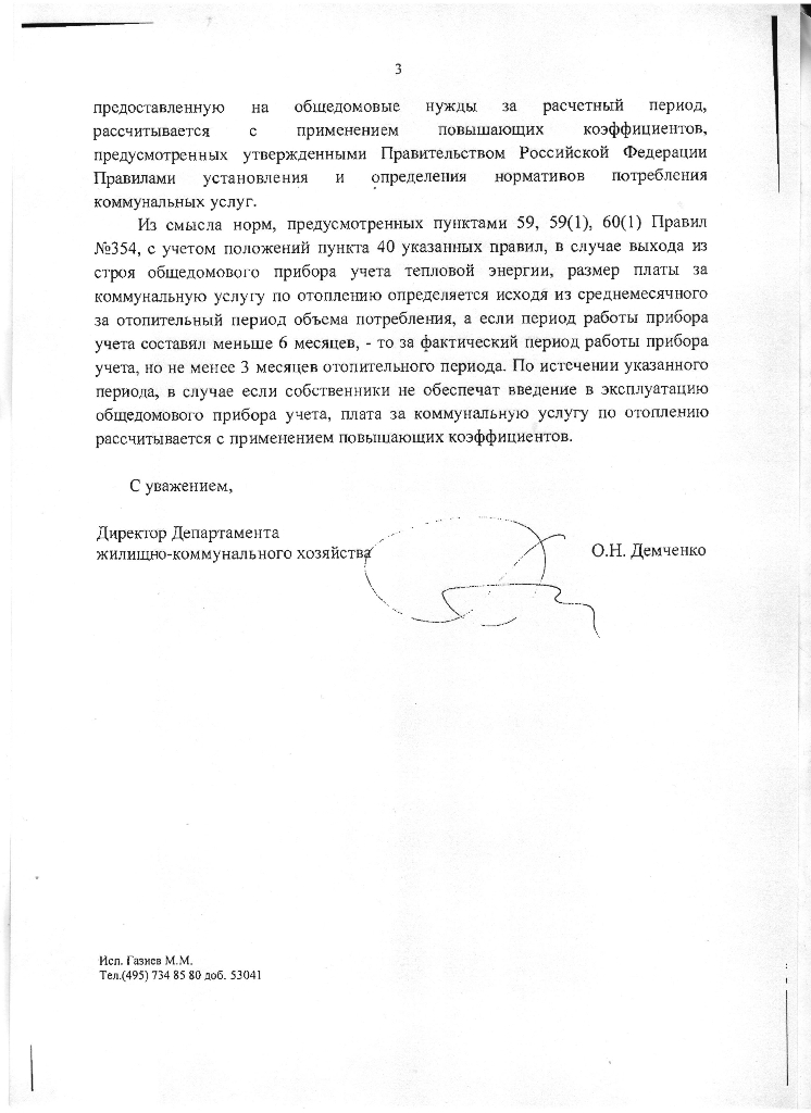 Мосжилинспекция обязала управляющую организацию привести порядок расчета размера плат за отопление в соответствие с п.42(1) (формула 3(1)) Правил предоставления коммунальных услуг гражданам, принимая к расчету среднемесячного объёма тепловой энергии общую площадь всех жилых и нежилых помещений в многоквартирном доме. Также ГБУ получило предписание на проведение перерасчета.