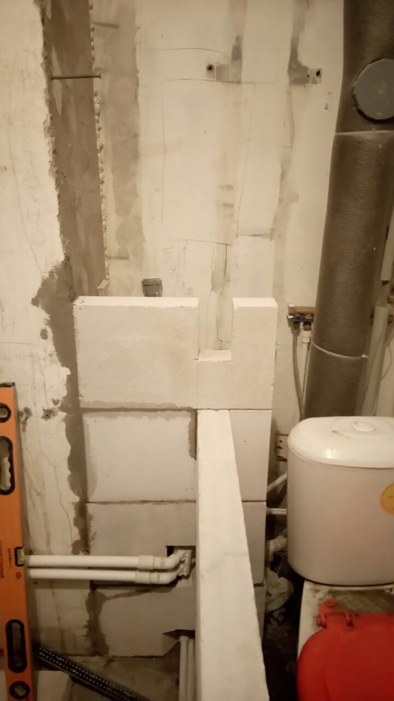 Добрый день. Сантехники УК перепаяли стояки и мы смогли двигаться дальше. Развели канализационные трубы и возвели стену из влагостойких ПГП с армированием проема. Для чего армировка? см. ссылку: