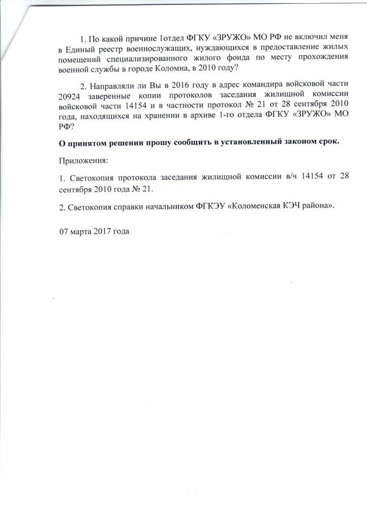 #11Здравствуйте всем, подскажите является ли отказ в представлении служебного жилья правомерным, если в детстве когда мне было ещё 5 лет мать включила в договор соц найма, в настоящий момент с 2014 года служу по контракту выписался и прописался при части, собрал необходимые документы и отправил в Новороссийск ружо, мне позвонили и сказали что отказывают в представлении служебном жилье,объяснив что я намеренно ухудшил своё положение, ухудшил понимаете!!! Где эта общага разваливается не сегодня так завтра она рухнет и требуется в капитальном ремонте, но для них я ухудшил своё положение,офицально на бумажечке мне никто не присылал этот ответ с лета 2016 по настоящее время 26.03.2017 год. Там где я раньше жил это общежитие в нем прописанно сейчас 3 человека это брат, сестра и мать , и бабушка не прописанно инвалид которая не ходит квадратура 32 кВ.м. Сейчас планирую женится, а вести свою будущую не куда, подскажите что делать