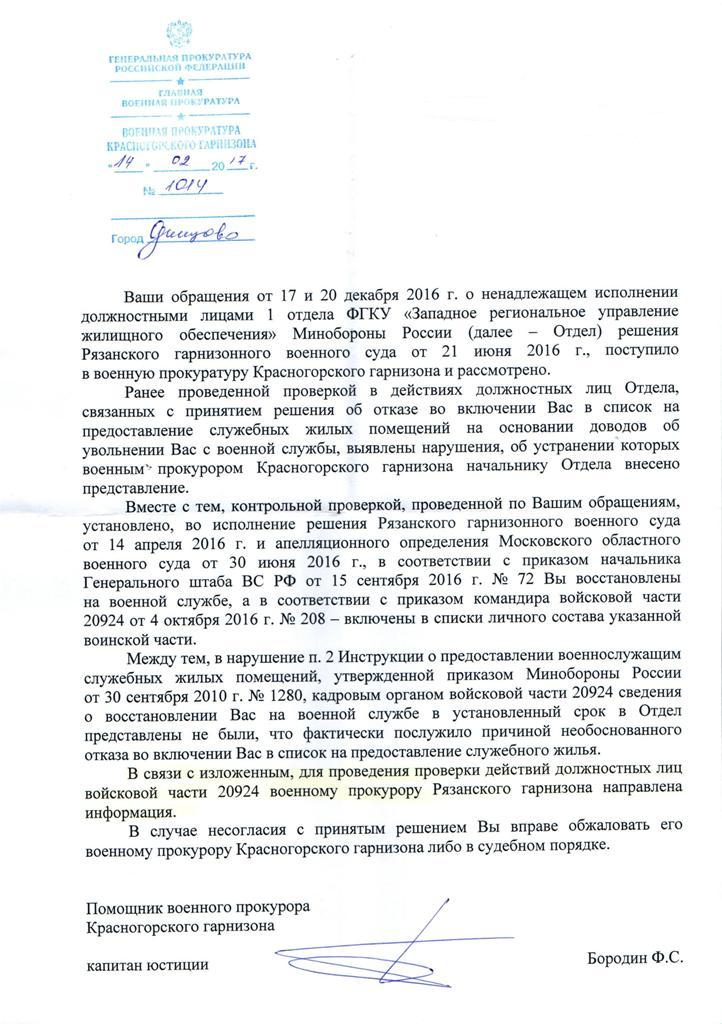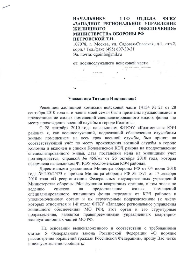 В 1 отделе ФГКУ «Западное региональное управление жилищного обеспечения» МО РФ (далее по тексту 1 отдел «ЗРУЖО» МО РФ) с момента моего обращения по жилищному вопросу происходят чудеса. Так, начальник 1 отдела «ЗРУЖО» МО РФ Петровская Т.Н. открыла мне дивный новый мир в котором оказывается, представления военного прокурора Красногорского гарнизона необязательны к исполнению!