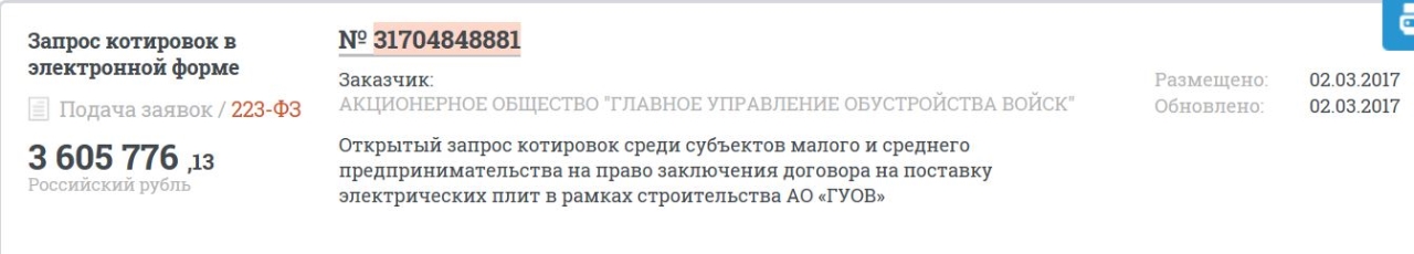 № 31704848881 Заказчик: АКЦИОНЕРНОЕ ОБЩЕСТВО "ГЛАВНОЕ УПРАВЛЕНИЕ ОБУСТРОЙСТВА ВОЙСК"