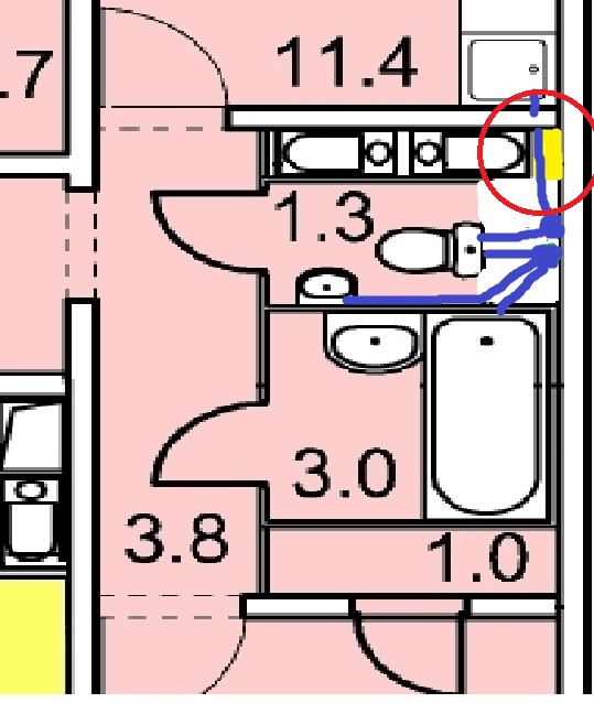 По поводу пустоты: два короба вентиляции действительно не занимают все пространство между стеной кухни и перегородкой, в углу имеется пустота примерно см 50 шириной по всей высоте помещения. Стена кухни несущая и толщины см 20, звуки с туалета в кухню сквозь эту стену пройдут вряд-ли, а вот через отверстие в стене в котором проходят трубы на кухню возможно. Но если нормальную построить перегородку скрывающую трубы то звуков в кухне нет.
