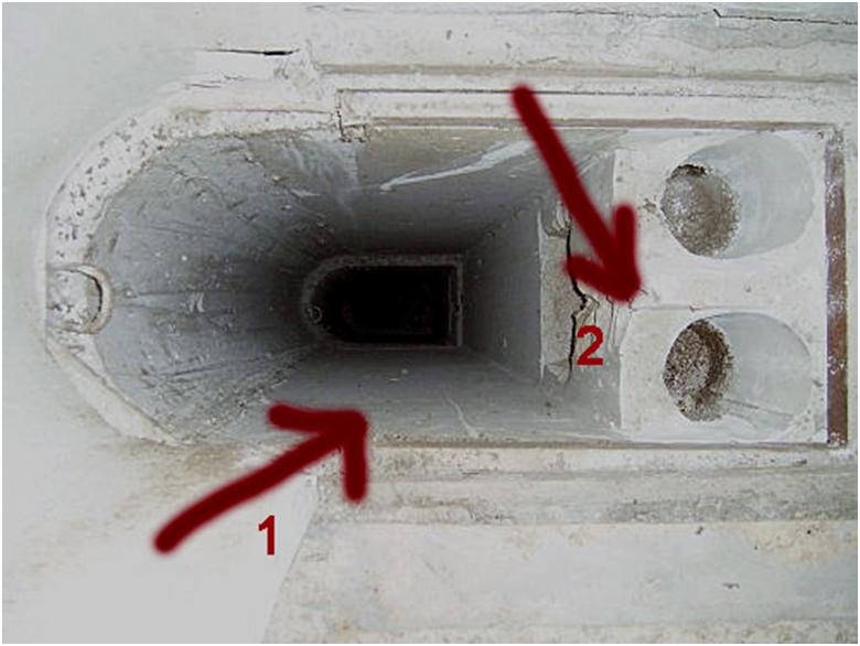 На фото (не наших вентблоков, похожих для образца) видно: 1- общий сборный вентканал, 2 - каналы-сателлиты. Чуть ниже поз. 2 видно выход сателлитов с предыдущего этажа в общий сборный канал.