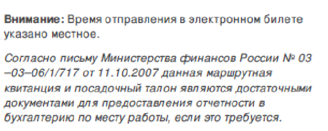 ............Если Вам необходимо представить финансовые отчётные документы о полете, сохраняйте посадочный талон и маршрут-квитанцию. Обращаем Ваше внимание на то, что контрольно-кассовые чеки не выдаются. В соответствии с Приказом Минтранса РФ от 18.05.2010 № 117, письмом Министерства Финансов РФ от 07.09.2007 № 03-03-06/1/649 и письмом УФНС России по г. Москве от 27.12.2007 № 20-12/124839 документами для отчёта о совершении полёта являются маршрут-квитанция с приложением посадочного талона. Дубликаты посадочных талонов не выдаются.