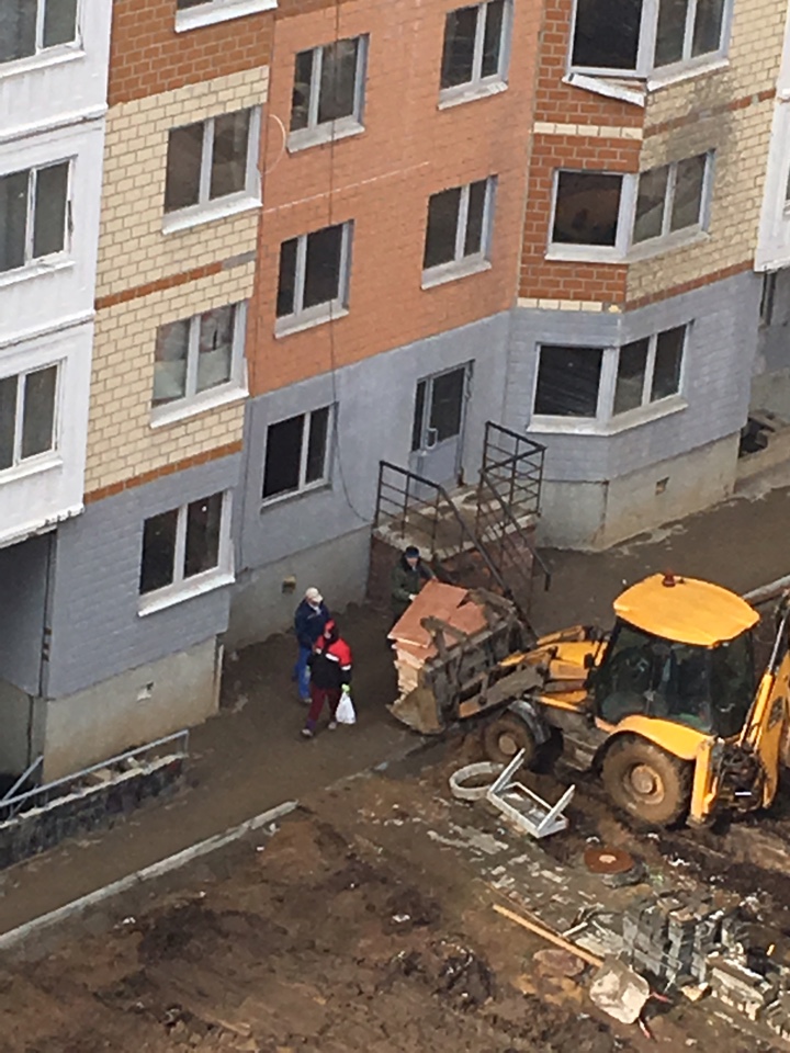 Далее, пойдя по раскопкам и обойдя технику, входим в первый подъезд 6-г корпуса. Везде попадаются работники подрядчика.