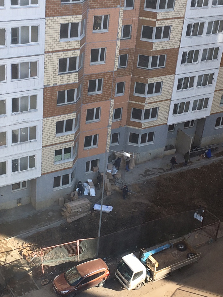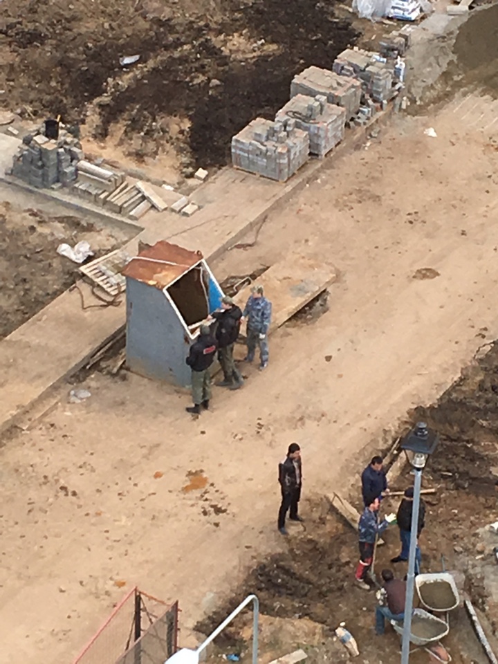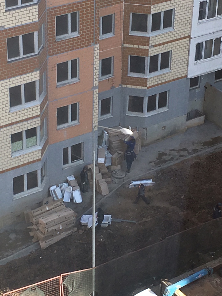 #37280Добрый день! 9 корпус сегодня кипит! С утра был аврал: прибыло все начальство местное и рабочие под их надзором переносили стройматериалы из 5-7 подъезда в 1-4. Потом началась разметка под новые клумбы и дорожки между 9 и 10 корпусом.