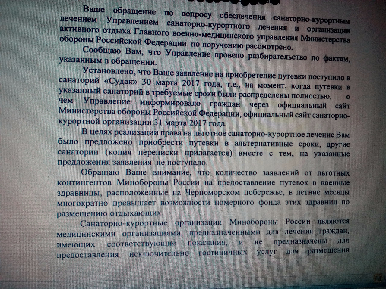 #2722Здравствуйте! Представляю Вашему вниманию ответ санатория. В ответе указано, что "путевки реализованы в полном объеме установленным порядком 31 марта 2017 г.", но как я указывал ранее после этой даты были предложены как минимум три путевки. Полученный ответ отправлю эл.приемную на сайте МО РФ что бы приложили его к моей жалобе.