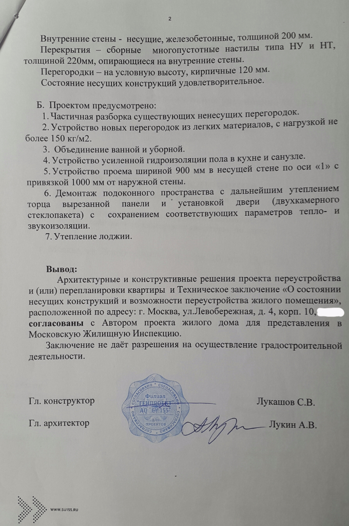 1. Зная что документы Проекта не будут согласованы Мосжилинспекцией, ООО "АПБ "Мозайка" заключает договора на изготовление проектной документации. Но тут уже принятие решения зависит только от заказчика. Я на это пошел потому что все переустройства хочу сделать только на законных основаниях.