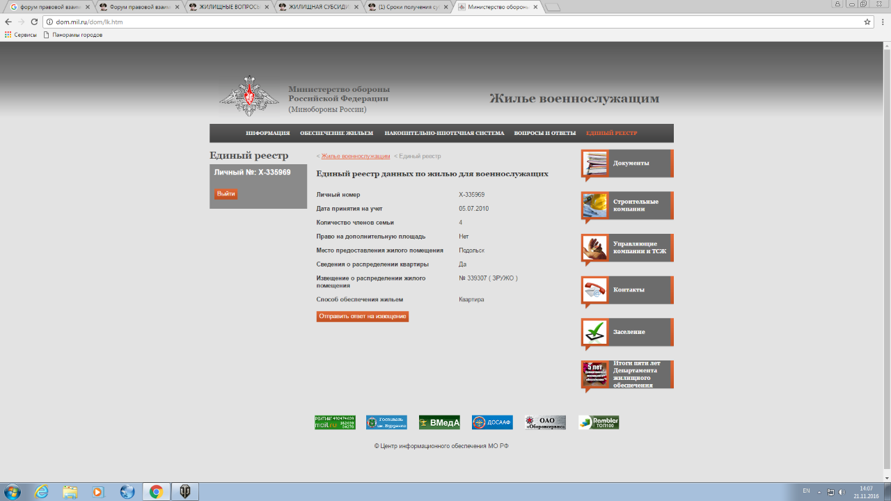 #39898Интересная ситуация: контракт заключен до пред. возраста до 7 ноября 2017 год (выслуга 26 календарей), служу в Молдавии (за рубежом), в январе этого года написал рапорт на увольнение, собрал весь комплект документов (вместе со всеми ихними хотелками) в феврале отвез и сдал, на мои просьбы где-то зарегистрировать документы- ответили отказом, отказались расписываться в описи доков( я сделал 2-экз.описи).Стою в реестре с 2010 года. Сыну 23 года исполняется в октябре, учится .В конце марта начал звонить в департамент, интересоваться положением дел, сказали, что мое дело находится у юриста и у меня нет основания стоять в реестре с 2010 года, а год постановки будут рассматривать как "за год до наступления предельного возраста т.е. 2016 год" .Я ответил, ну и ладно, пришлите мне документы на что вы ссылаетесь. Обещали прислать, но пока тишина. У меня произошли изменения в реестре, на момент поездки в Питер, была распределена квартира в Подольске- я написал отказ в департаменте (находится квартира на краю жизни, рыночная стоимость 5м 400тыс. + за превышение доплатить 600 тыс.) После моих звонков сделали изменение в реестре сняли квартиру, оставили в очереди на Москву. Сегодня просто зашел в реестр, опять распределение новый номер извещения. Я пошел к нашему представителю департамента уточнить ГДЕ квартира. Она мне говорит что у меня пропало основание быть нуждающимся, так как НЕТ моих документов и я должен буду их собрать заново.Дозвонился в департамент , мне ответили то-же самое, сказали ждите бумагу. И я не знаю чего мне делать ??