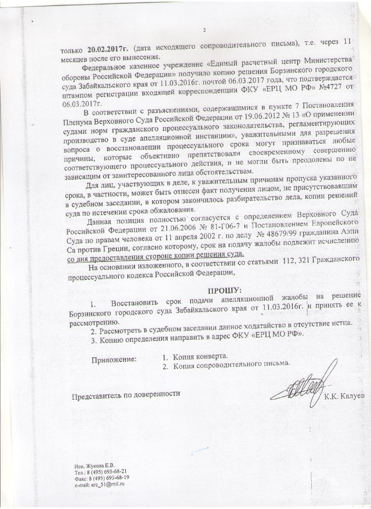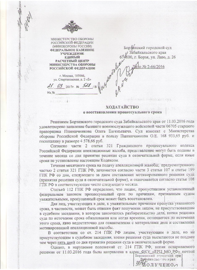 28.04.2017 года Борзинским городским судом Забайкальского края вынесено определение по гражданскому делу по иску Пшеничникова О.Е. к Министерству обороны Российской Федерации, Федеральному казенному учреждению «Единый расчетный центр Министерства обороны Российской Федерации» о взыскании денежного довольствия, на основании которого ФКУ «ЕРЦ МО РФ» восстановлен срок для подачи апелляционной жалобы на решение суда по указанному гражданскому делу.