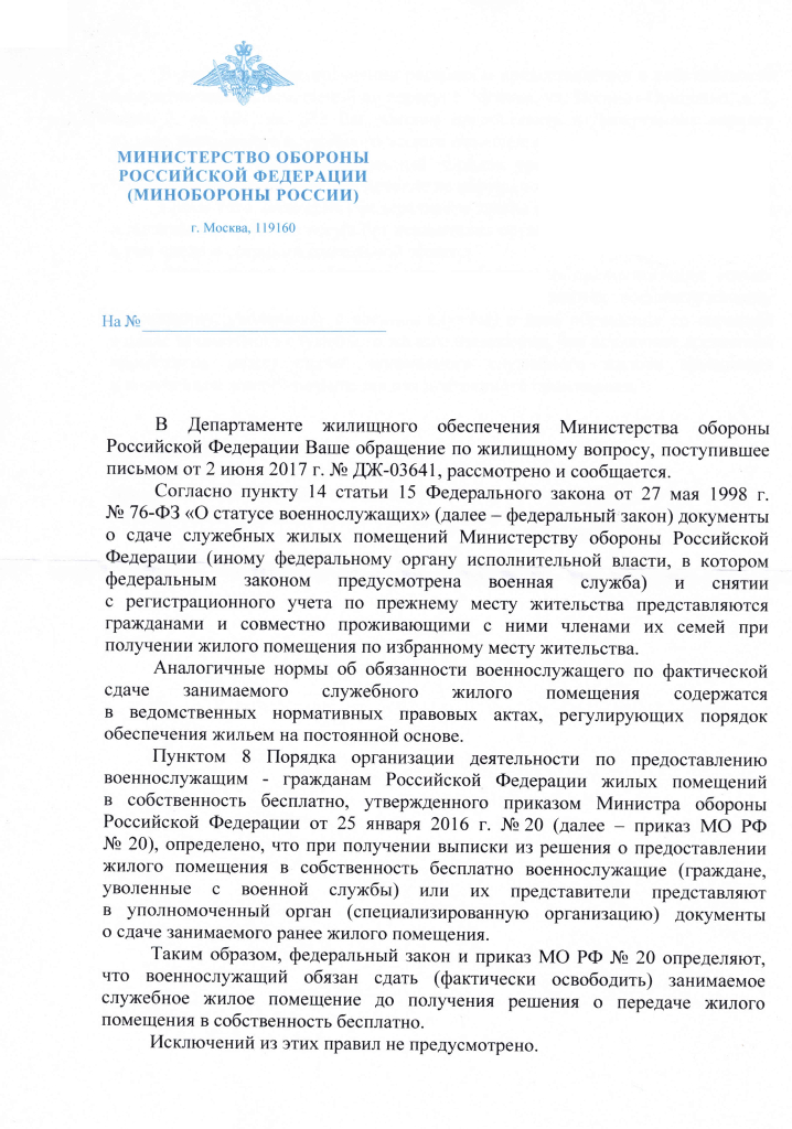 #32657Вопрос был не о том, как сдать служебку, а о законности действий ДЖО и где жить в период оформления документов, ремонта и т.д.[ref]zevs_lambert[/ref],Вы у них сами запрашивали как сдать служебку?QR_BBPOST Ответ ДЖО по сдаче служебного жилья.