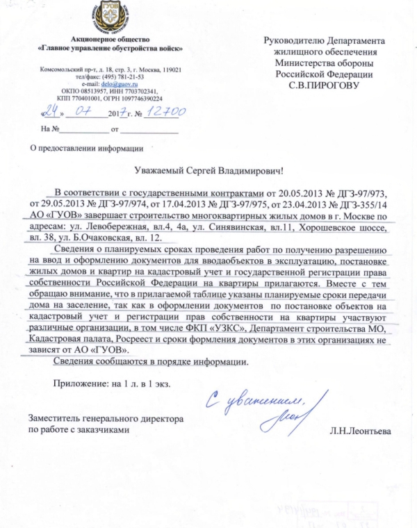 Информация подготовлена на основании письма заместителя генерального директора по работе с заказчиками АО «ГУОВ» Леонтьевой Л.Н. от 24 июля 2017 г. № 12700., а так ... "филькина грамота"