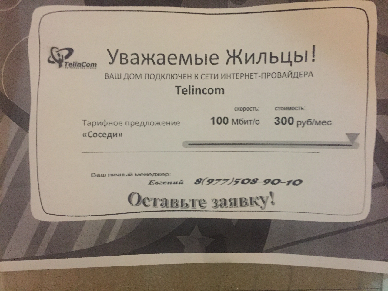 Позвонили вечером из компании-провайдера (название не запомнил, было не сильно интересно пока), предложили подключение интернета и прочего телевидения.