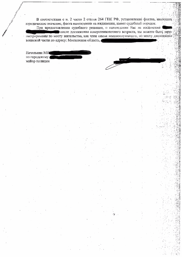 2.Так меня прописывают при части, а ребенка отказываются, по причине отсутствия ее в л.д. При чем в Москве такой вопрос не стоял, дали временную регистрацию без вопросов.