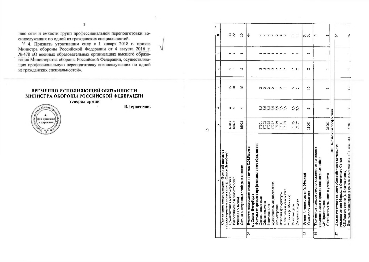 4. Признать утратившим силу с 1 января 2018 г. приказ Министра обороны Российской Федерации от 4 августа 2016 г. №478 «О военных образовательных организациях высшего образо-вания Министерства обороны Российской Федерации, осуществляю¬щих профессиональную переподготовку военнослужащих по одной из гражданских специальностей».