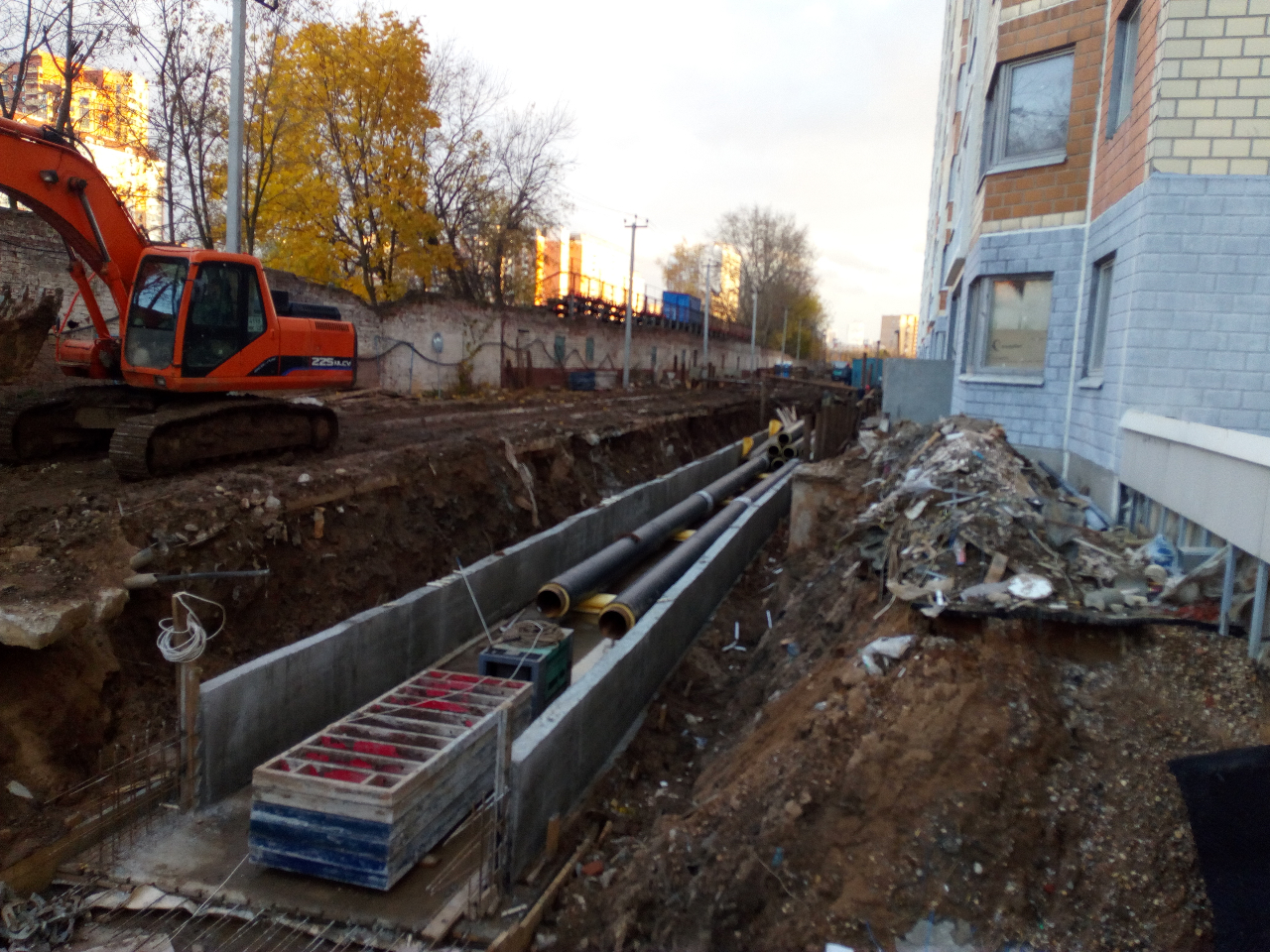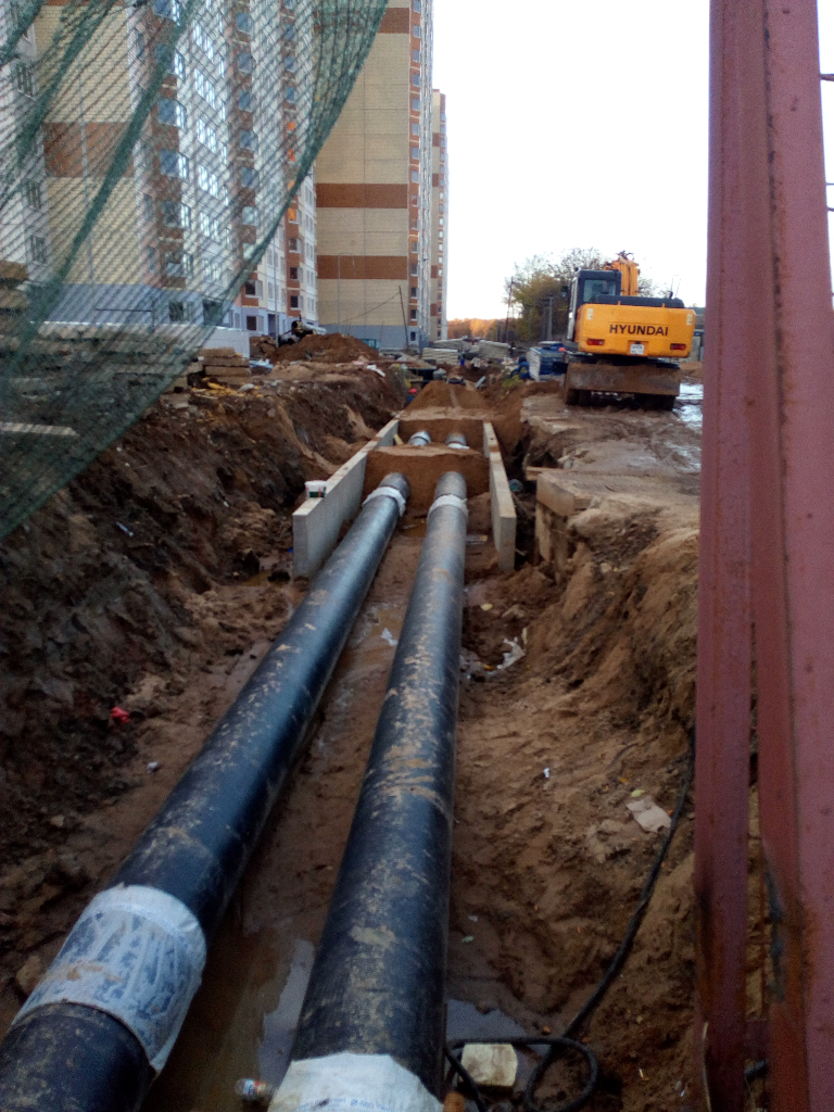 Теплотрассу к 9к наполняют водой, засыпают песком у 15к, затем опрессовка. Когда будем отопление в 9к рабочие не смогли сказать (рабочих по-моему стало больше). Работ на участке от 9к к ИТП 8к по их словам менее чем на месяц.