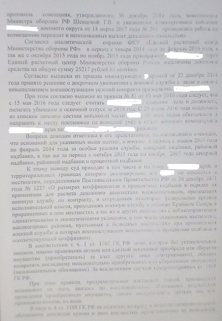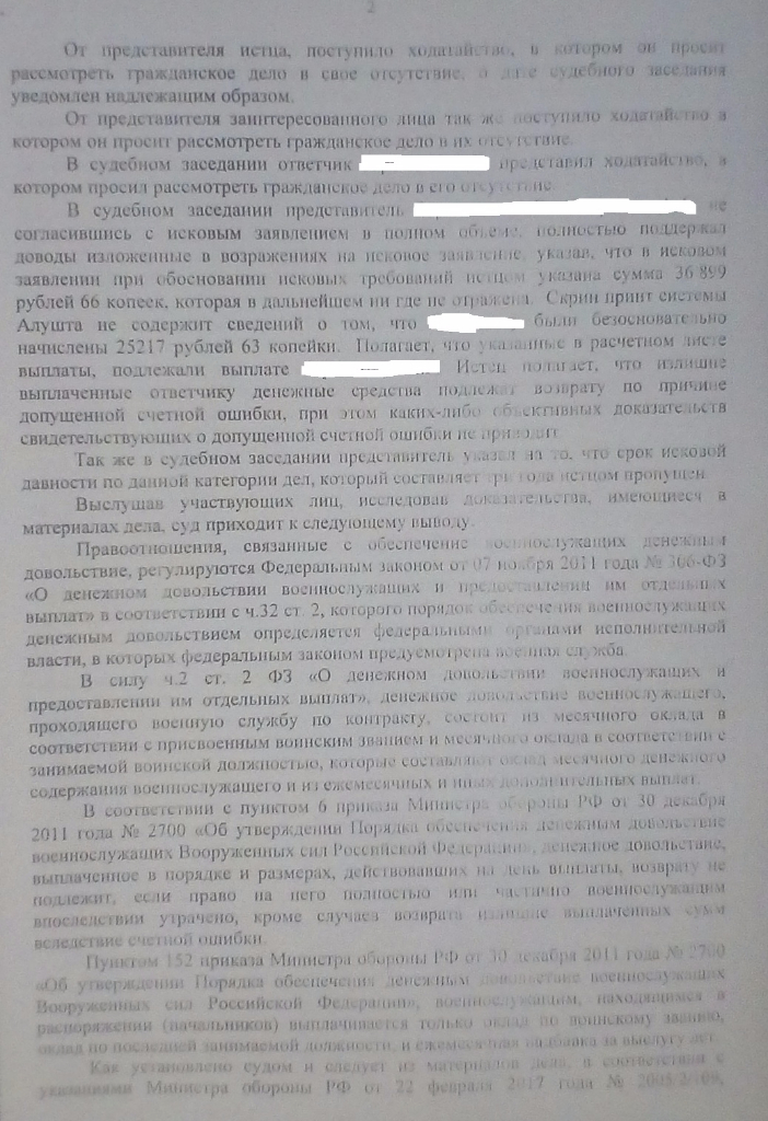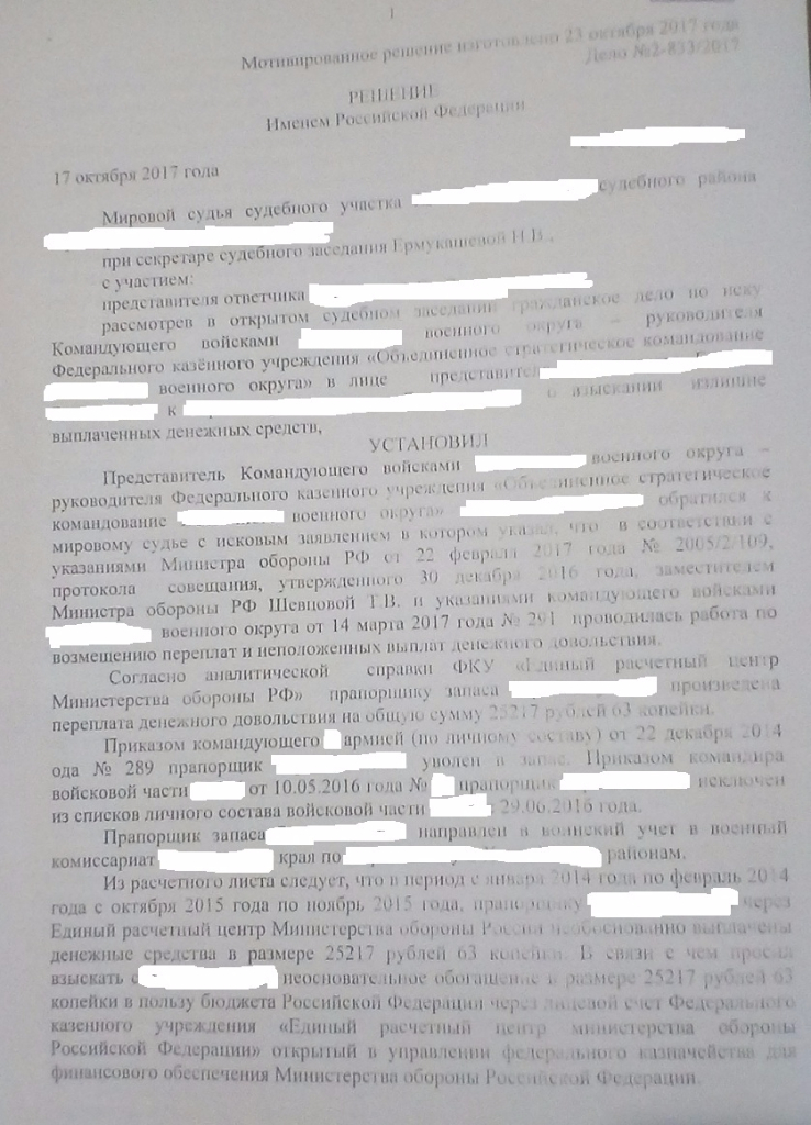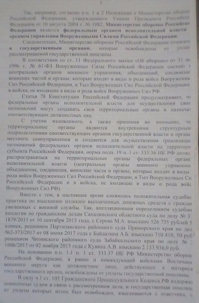 #4317Здравствуйте черноморец! Я вам в личку скинул аргументы для составления возражения. И ещё, если будете подавать возражение в суд, приложите к нему ходатайство об истребовании из части результатов административного расследования по факту переплаты и образования в связи с этим материального ущерба, ссылаясь на ст. 7 ФЗ "О материальной ответственности военнослужащих". Мне в своё время из за отсутствия данного расследования и виновных действий с моей стороны получилось отстоять приличную сумму, но там предметом разбирательства была денежная компенсация за аренду жилья...Здравствуйте. Подскажите, пожалуйста, как составить возражения и какие аргументы озвучить на заседании.