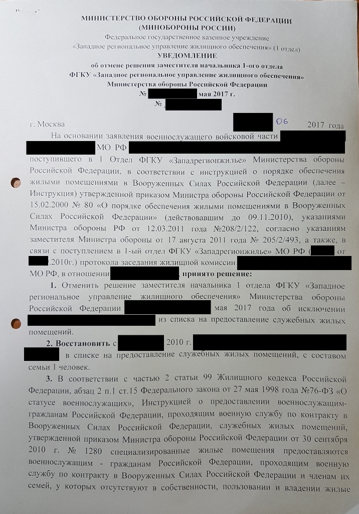 #180Недавно пришло письмо от ЮРОЖО: цитирую: "Из представленных документов усматривается, что согласно свидетельству о праве на собственности на жилье от 01.02.95г Вам пренадлежала 1\4 доля жилого помещения. п.2 ст. 99 ЖКРФ №188-ФЗ предусмотрено, что служебные жилые помещения предоставляются гражданам, не обеспеченным жилыми помещениями в соответствующем населенном пункте. Таким образом, оснований состоять сыну в списке на предоставление служебного жилого помещения по месту прохождения службы в Севастопольском гарнизоне, не имеется, а Вы подлежите исключению." 1\4 подарил матери в 2005г. Документы прилагались. С 2015г стоял на очереди. В связи с расширением семьи (принес документы на 3го сына) дело пересмотрели и сняли