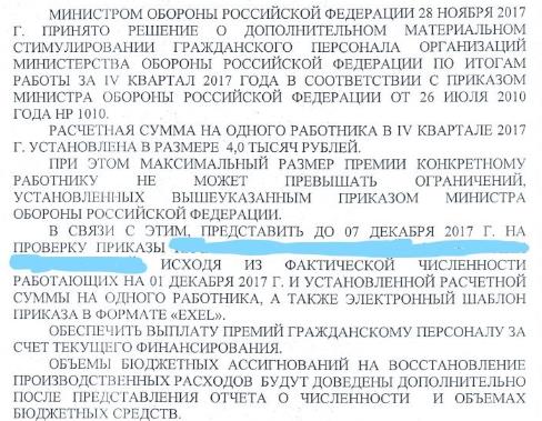 Мною 21.12.2017г. было направлено в Главную военную прокуратуру заявление об устранении нарушений распределения денежных средств, выделяемых на цели премирования из экономии фонда оплаты труда, которое предлагаю для вашего обозрения (в приложении).
