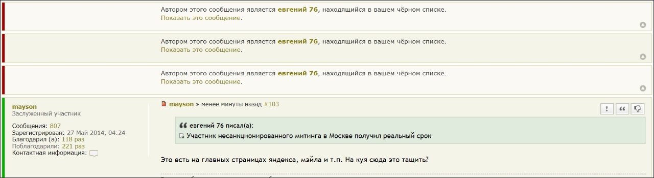 #102Это есть на главных страницах яндекса, мэйла и т.п. На куя сюда это тащить?QR_BBPOST Участник несанкционированного митинга в Москве получил реальный срок