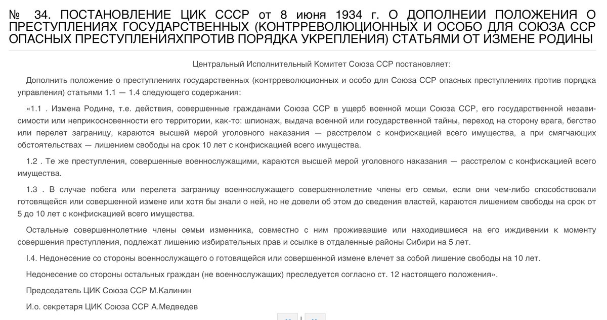 #1098 июня 1934 - в СССР принят закон «Об измене родине», предусматривающий коллективную ответственность членов семьи за недонесение