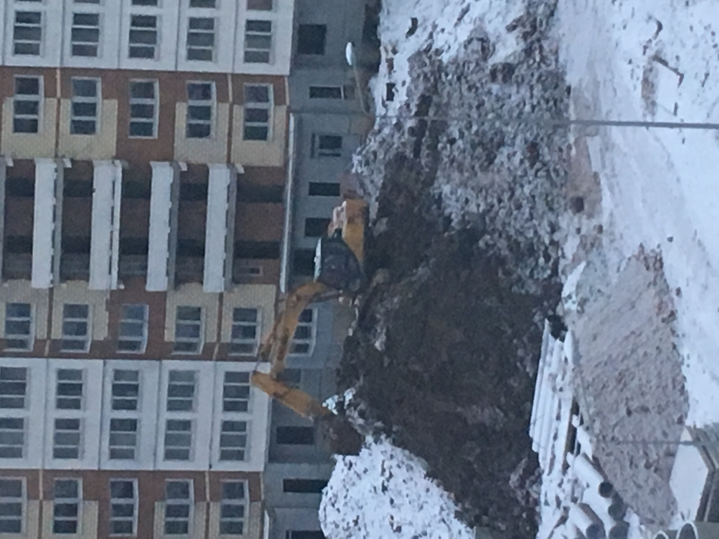 24к бригада внутри двора продолжает работу на колодцах, экскаватор все время в работе, есть бригада внутри корпуса.