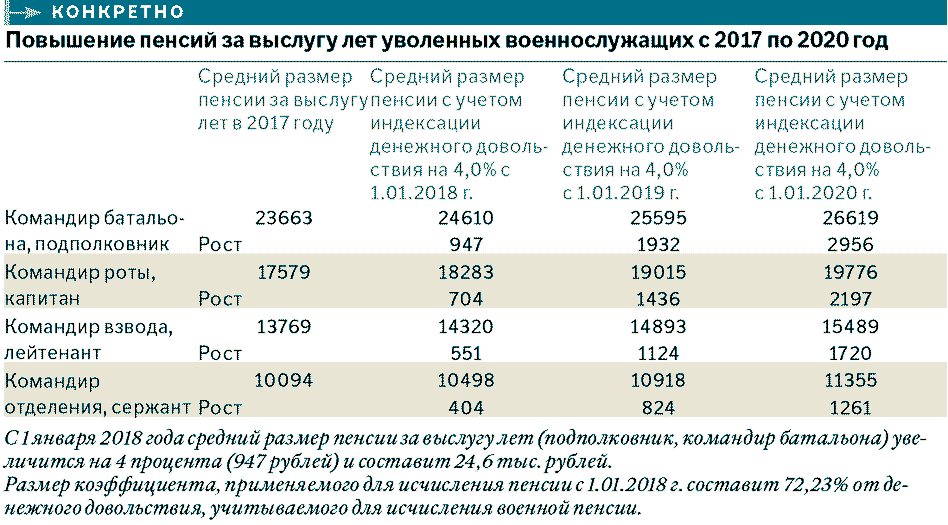 Чистова: Такие расчеты делались. Например, сейчас бывший командир взвода с достаточной для пенсии выслугой, скажем 25 лет, после увольнения получает 6900 рублей в месяц. В новой системе у него будет около 10 тысяч. У командира полка пенсия вырастет с 10,7 до 18,5 тысячи.