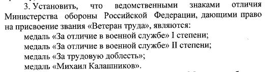 Таким образом, указанным письмом разъяснена статья 7 Федерального закона «О ветеранах», в соответствии с которым, ветеранами труда являются лица, награжденные орденами или медалями, либо удостоенные почетных званий СССР или Российской Федерации, либо награжденные ведомственными знаками отличия в труде, и имеющие трудовой стаж (то есть общую продолжительность трудовой деятельности в календарном исчислении): мужчины – не менее 25 лет, женщины – не менее 20 лет.