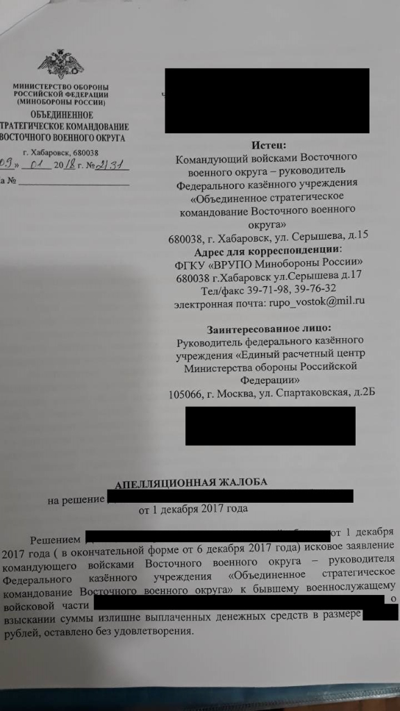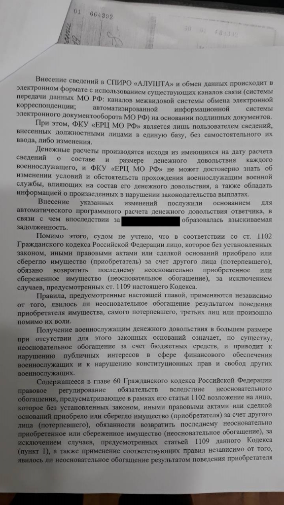 #4438Вкратце о своем деле. В 2016 году уволился с ВС РФ, в 2017 году году пришло приглашение в суд. ЕРЦ и ВВО решили взыскать с меня выплаченное больше чем положено выслугу лет( я так понимаю такая тенденция по всей матушки России). Первую инстанцию я выиграл. Суд долго решал что же делать со мной , целых два дня.