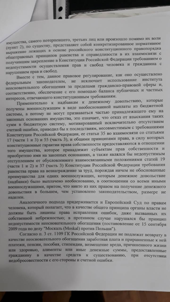 Следуя логике названного суда, поскольку положения ст.1102 и ст.1109 ГК РФ в отношении меня не применимы, тогда в отношении меня как действующего военнослужащего должен быть, применен Федеральный закон РФ от 12 июля 1999 года № 161-ФЗ «О материальной ответственности военнослужащих». Однако никакой нормы Закона в соответствии с которой с меня должны быть взысканы денежные средства, суд в своем определении № 4Г-691/2017 от 15 декабря 2017 года, так и не указал! В связи с чем, Законность такого определения вызывает сомнение.