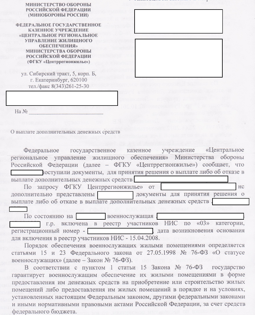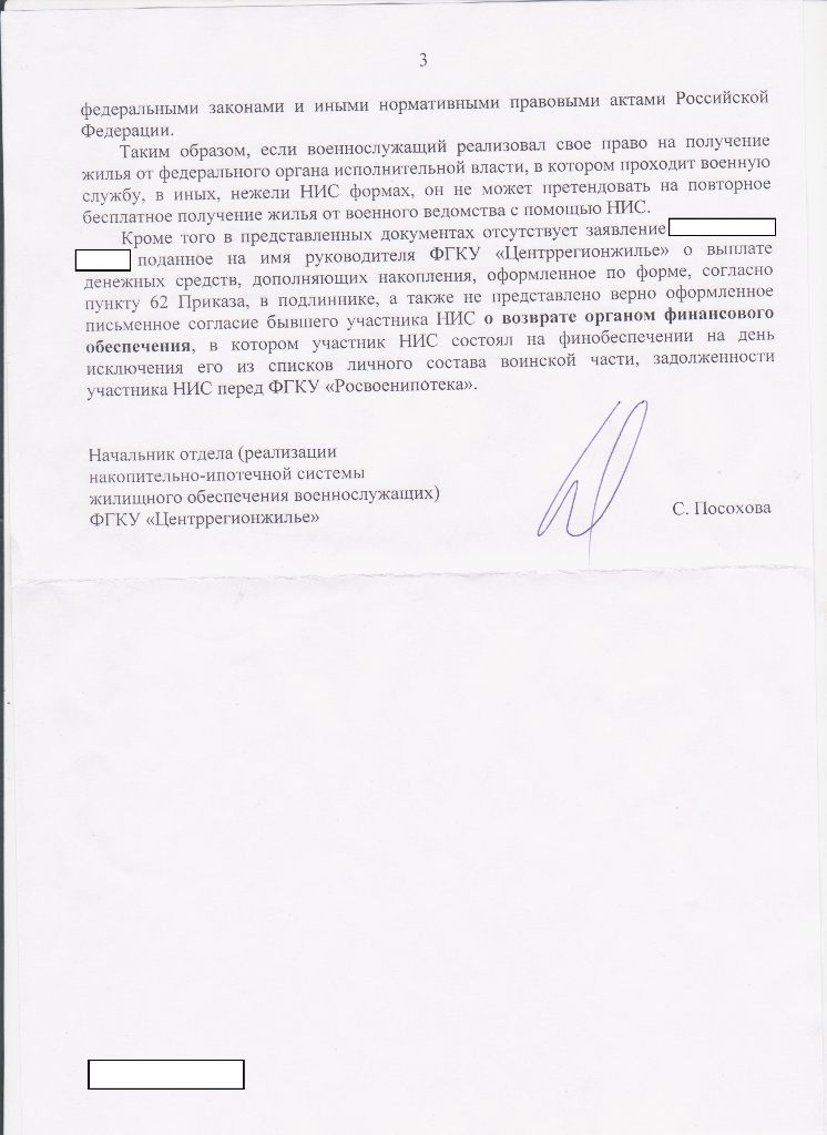 #5783Надо смотреть документ, как уже выше написали. Отказ есть смысл обжаловать в суде в трехмесячный срок.Приветствую! Пришел отказ с ФГКУ по выплате допов (напомню, я военнослужащая, уволенная в декабре 2017г. по ОШМ выслуга 12,5 , участник НИС , приобрела квартиру с использованием ЦЖЗ, ранее до включения меня в НИС муж военнослужащий получал на меня как на члена семьи квартиру по договору соц.найма)..Мало того, в письме указано, что я реализовала свое право на жилище посредством фед. бюджета и повторное обеспечение (путем реализации права на жилище как участника НИС ) у меня отсутствует!! Что это значит,??? что все накопления я должна буду вернуть?? и что не имела права приобретать квартиру??