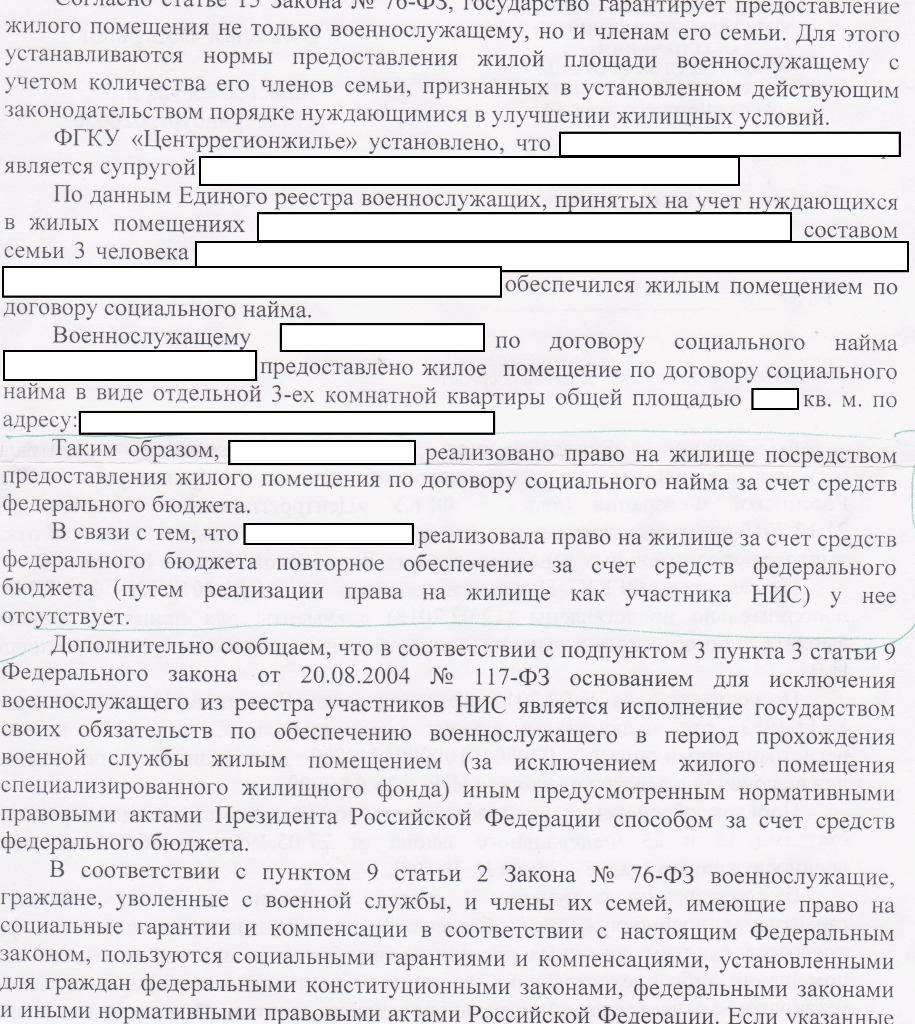 #5782Надо смотреть документ, как уже выше написали. Отказ есть смысл обжаловать в суде в трехмесячный срок.Приветствую! Пришел отказ с ФГКУ по выплате допов (напомню, я военнослужащая, уволенная в декабре 2017г. по ОШМ выслуга 12,5 , участник НИС , приобрела квартиру с использованием ЦЖЗ, ранее до включения меня в НИС муж военнослужащий получал на меня как на члена семьи квартиру по договору соц.найма)..Мало того, в письме указано, что я реализовала свое право на жилище посредством фед. бюджета и повторное обеспечение (путем реализации права на жилище как участника НИС ) у меня отсутствует!! Что это значит,??? что все накопления я должна буду вернуть?? и что не имела права приобретать квартиру??