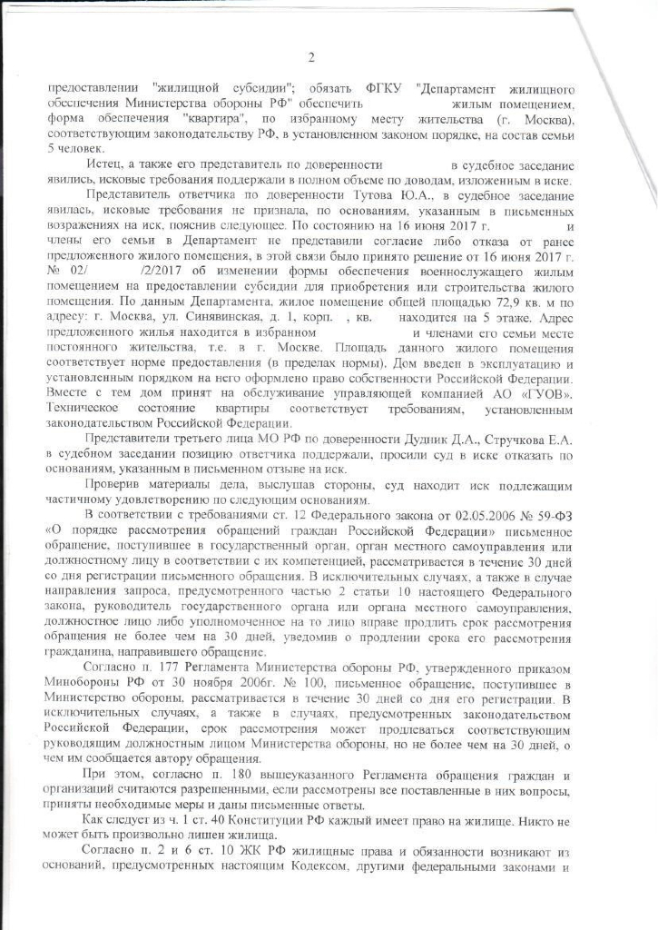 В целях информирования граждан о законности действия Департамента в отношении военнослужащих, граждан, уволенных с военной службы, которые отказались от предложенных жилых помещений, расположенных по адресу: г. Москва, ул. Синявинская, д. 11, в части, касающейся изменения им формы обеспечения на жилищную субсидию, доводим апелляционное определение Судебной коллегии по административным делам Московского окружного военного суда от 21 сентября 2017 г. № 33а-1392, которым решение Московского гарнизонного военного суда от 3 июля 2017 г. по административному делу № 2а-462/2017 по заявлению военнослужащего Р. оставлено без изменения, а апелляционная жалоба – без удовлетворения.