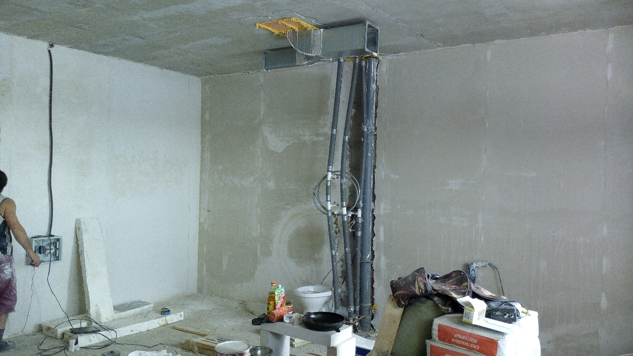 2-х комнатная на Левобережной - демонтаж, штукатурины стены, перепаяны стояки, готова разводка воды, возводятся ПГП стены. (подготовка к замене батарей и разводки электрики)
