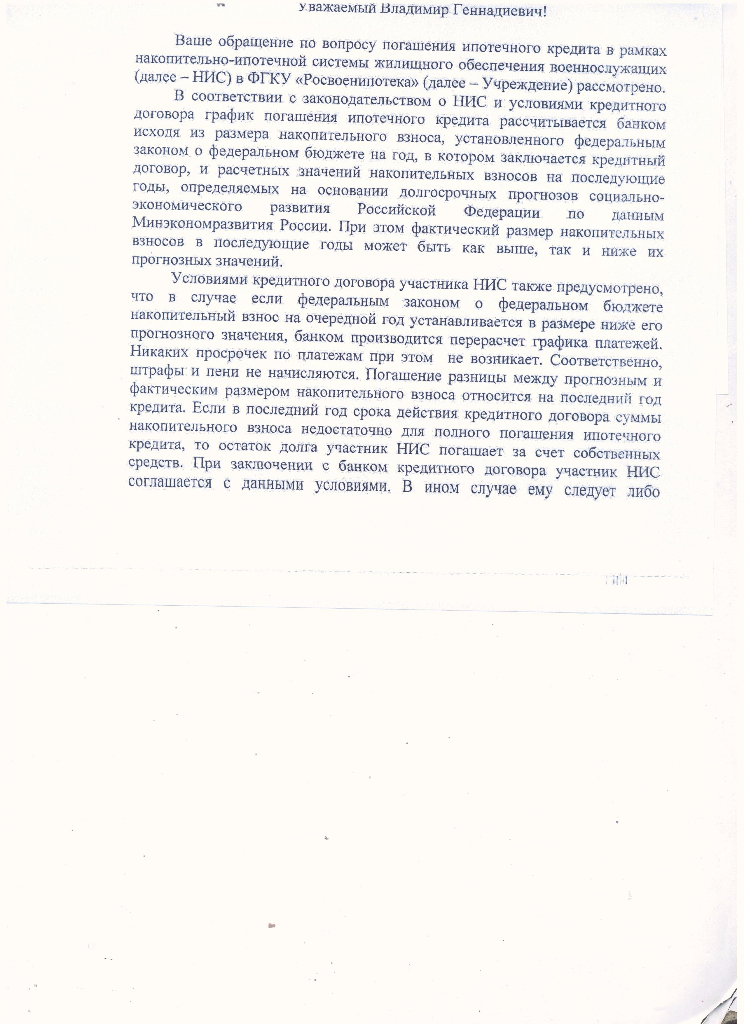 Спасибо большое за участие и советы. Немного не соглашусь с Вами, по поводу графика платежей... Он расписан на все время предоставления кредита, в данном случае на 10 лет, подписан и утвержден всеми сторонами. Данный график предусматривает аннуитентный характер погашения, то есть сначала платятся почти одни проценты, потом гасится основной долг. Однако, при составлении первоначального графика, там было учтено положение Федерального Закона 117-ФЗ (который действовал в то время без изменений), в связи с чем предусмотрена сумма погашения кредита нарастающим итогом, то есть заложен ежегодный рост выплат, поэтому размер платежей ежегодно увеличивается. Именно при нарушении погашения утвержденного графика, предусматривающего отсутствие увеличения платежей в 2016г., появляется корректирующая сумма 800тыс. (Про остальные года Банк не знает и прогнозов не строит, так что эта сумма- это штрафы на конец кредита от нарушение графика платежей в 2016г.). Про ее появление ни один специалист Банка ничего внятного не сказал. Кроме того, сейчас Банк не предъявляет никаких претензий по оплате долга с нарушением первоначального графика платежей (без учета роста выплат), однако, корректирующую сумму никто не отменил. Не совсем понятна просьба в Вашем бланке Заявления о "направлении остатка средств на именном счете на частичное досрочное погашение обязательств " Можно ли заемщику, не допуская просрочки, ежемесячно оплачивая за свой счет недостающую разницу по первоначальному графику платежей (что бы не было вообще никаких "корректирующих сумм") попросить Росвоенипотеку погасить его расходы за год? Если будет "частичное досрочное погашение обязательств по ипотечному кредиту" в конце года, то будет погашение процентов, штрафов и неустоек, начисленных Банком за год из-за допущенного нарушения графика платежей. В этом случае не факт, что имеющихся средств хватит для полного погашения штрафов и неустоек. Если досрочное погашение будет в начале года, когда штрафов и пени еще не будет, то средства пойдут на погашение основного долга, при этом в следующие месяцы, при не доплате ежемесячных сумм согласно графика платежа, штрафы и пени будут насчитываться, что не понизит как-то значительно "корректирующую сумму". С чего начинали, к тому и пришли...