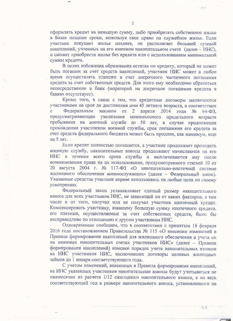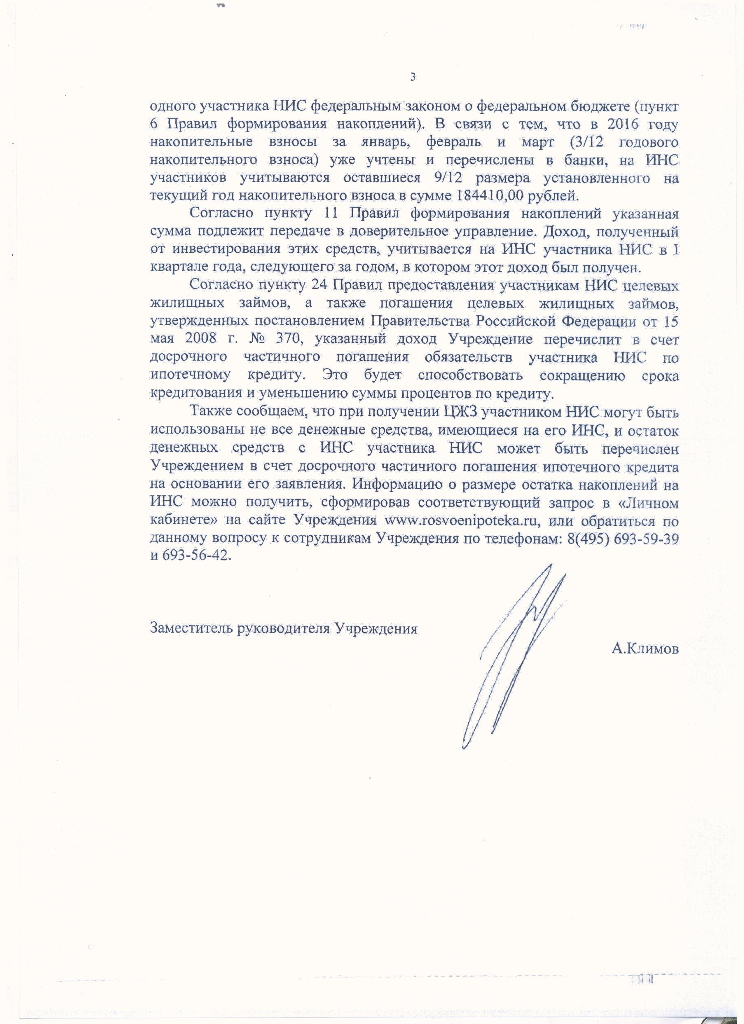 СОВЕТ откладывать конечно хороший, но вот незадача: сын за один 2016 год "недоплат" получил корректирующую сумму в 800 тыс. руб. Если недоплаты будут и в следующем году, то эта сумма увеличиться почти в двое и т.д. Если вы будете копить на стороне, уповая на то, что в случае недоплаты со стороны государства, Вы сможете компенсировать недоплату, то это не так, потому что, нарушая утвержденный при выдаче кредите график платежей, там пойдет такая неустойка, что мало не покажется никому. Так что лучше просто доплачивать по старому графику за свой счет и не допускать выставления штрафов за недоплату. Вот только вопрос: как оформить официально отношения с Росвоенипотекой в которых она как-то обязалась бы, в свете последнего постановления, компенсировать расходы военного при условии получения ею прибыли за год. Как можно заставить её заключить дополнительное соглашение к договору, который уже действует и в котором они успешно прописали, что при отсутствии роста выплат они никакой ответственности не несут.
