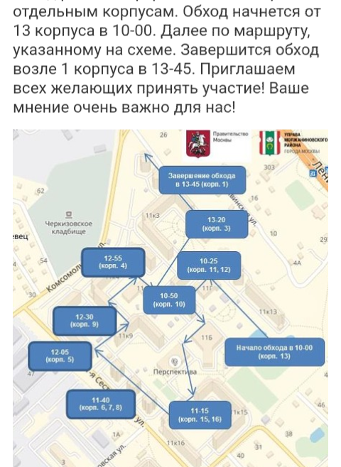 #33538[ref]Yulia Zhuk[/ref], сам глава управы Молж-го района будет на этом обходе? Откуда Вы получаете инф-ию об обходах? Следующие вопросы не к Вам.
