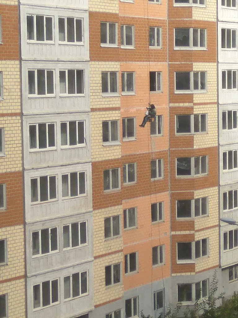 #50985Узнаю «гения инженерной мысли» ГУОВНа 4 корпусе замечен одинокий альпинист ,заделывает межпанельные швы