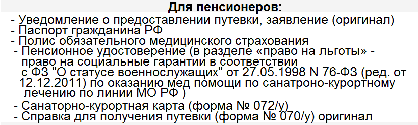 - Санаторно-курортную карту по ф. №072/у ("свежую", т.е. действующую на момент прибытия в санаторий).