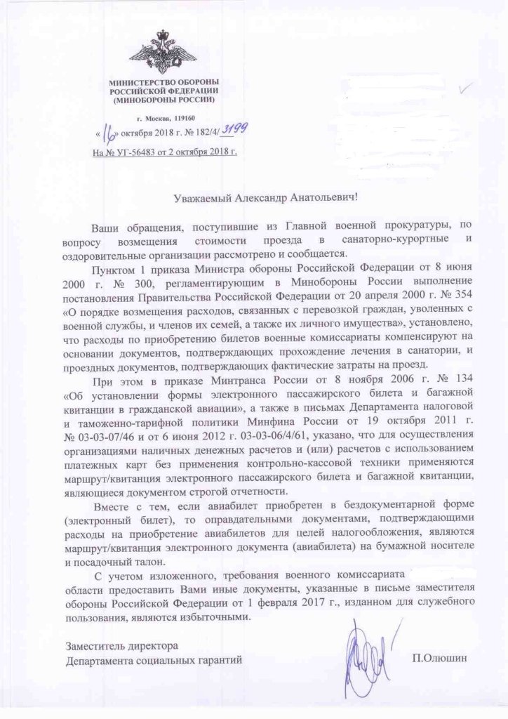 Ответ из МО РФ на мою жалобу по требованию военкомата прислать выписки из карты МО РФ отошло в сторону, типа не знаю, чего там творят в военкомате.QR_BBPOST Возможно требования выписки из карты для оплаты и противозаконны. Однако некая логика присутствует. Компенсация положена Вам. Значит Вы должны доказать, что именно Вы произвели оплату электронных билетов. И доказать можно только выпиской из банка.