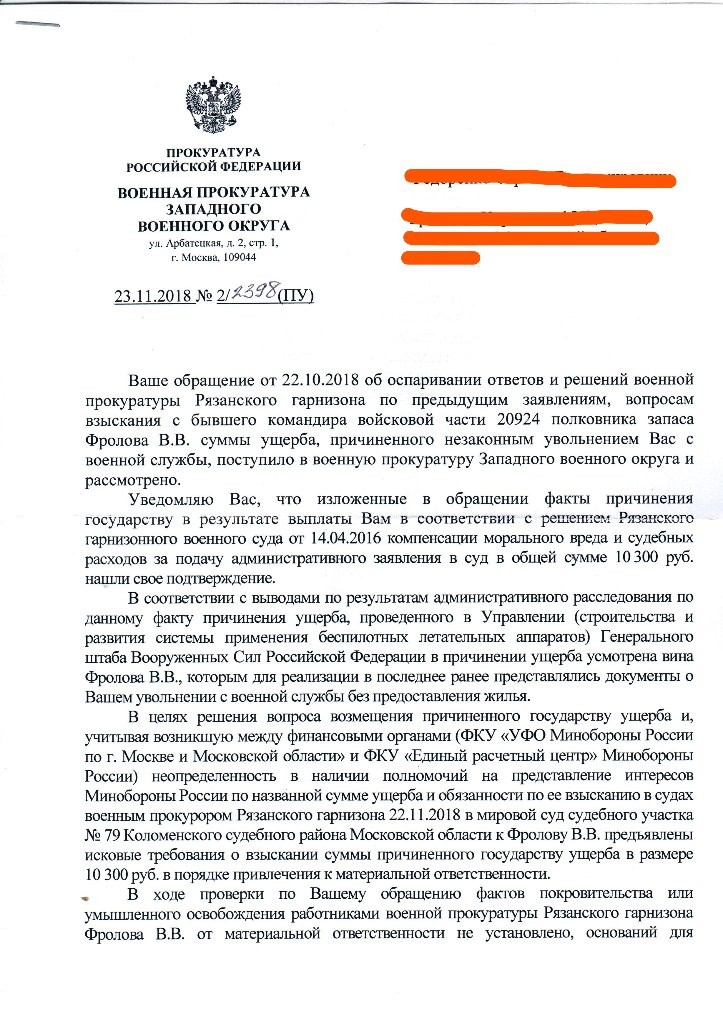 Из поступившего в мой адрес ответа № 6/6009 от 05 октября 2018 года, от военного прокурора Рязанского гарнизона я узнал, что проведённой в Управлении (строительства и развития системы применения беспилотных летательных аппаратов) ГШ ВС РФ административным расследованием установлена вина бывшего командира войсковой части 20924 полковника запаса Фролова В.В. в незаконном увольнении меня с военной службы, командиру войсковой части 20924 поручено взыскать причинённый государству ущерб с полковника запаса Фролова.