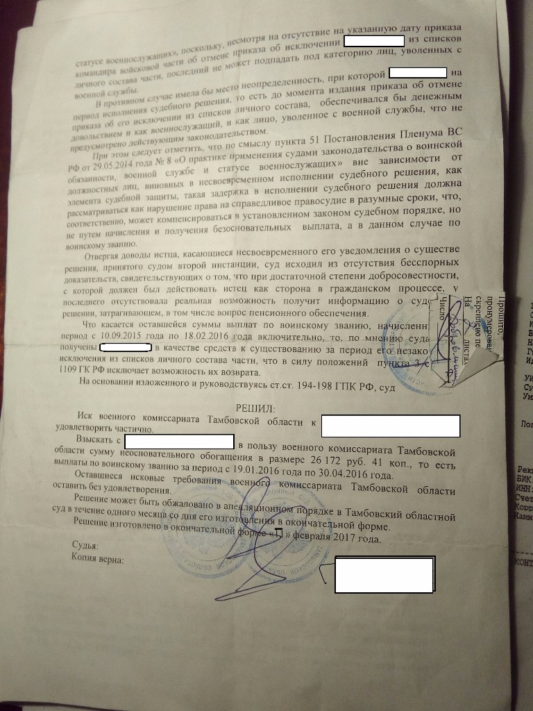 В начале 2016 года я был восстановлен в списках части. Военкомат подал в суд и выиграл 2 1/3 оклада за звание от 7 2/3 выплаченных раннее., обязав меня выплатить их за период с 19.01.2016 по 30.04.2016, поскольку судом было установлено что в это время я уже являлся военнослужащим по решению суда вступившего в законную силу и дальнейшие выплаты являлись противозаконными , о том что я являюсь военнослужащим с 19.01.2016 было известно и военкомату о чем сказано в решении.