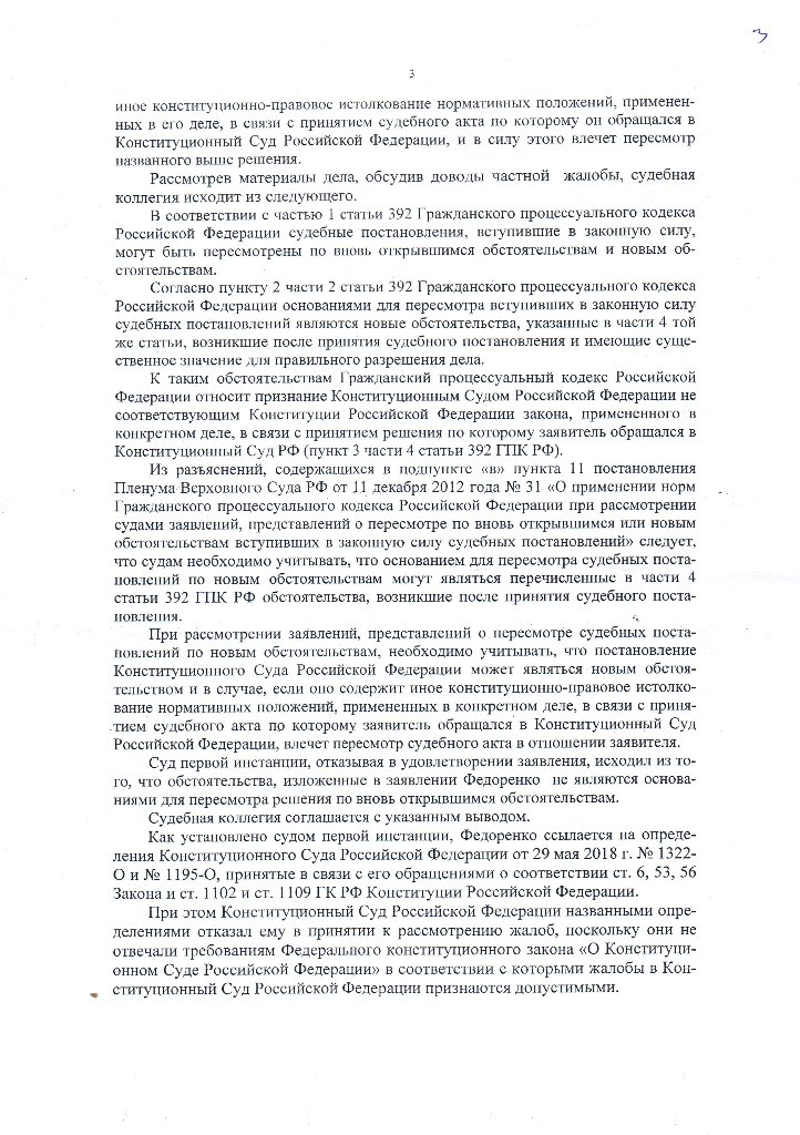 Согласно апелляционного определения: «При рассмотрении заявлений, представлений о пересмотре судебных поста¬новлений по новым обстоятельствам, необходимо учитывать, что постановление Конституционного Суда Российской Федерации может являться новым обстоя¬тельством и в случае, если оно содержит иное конституционно-правовое истолко¬вание нормативных положений, примененных в конкретном деле, в связи с приня¬тием судебного акта по которому заявитель обращался в Конституционный Суд Российской Федерации, влечет пересмотр судебного акта в отношении заявителя.