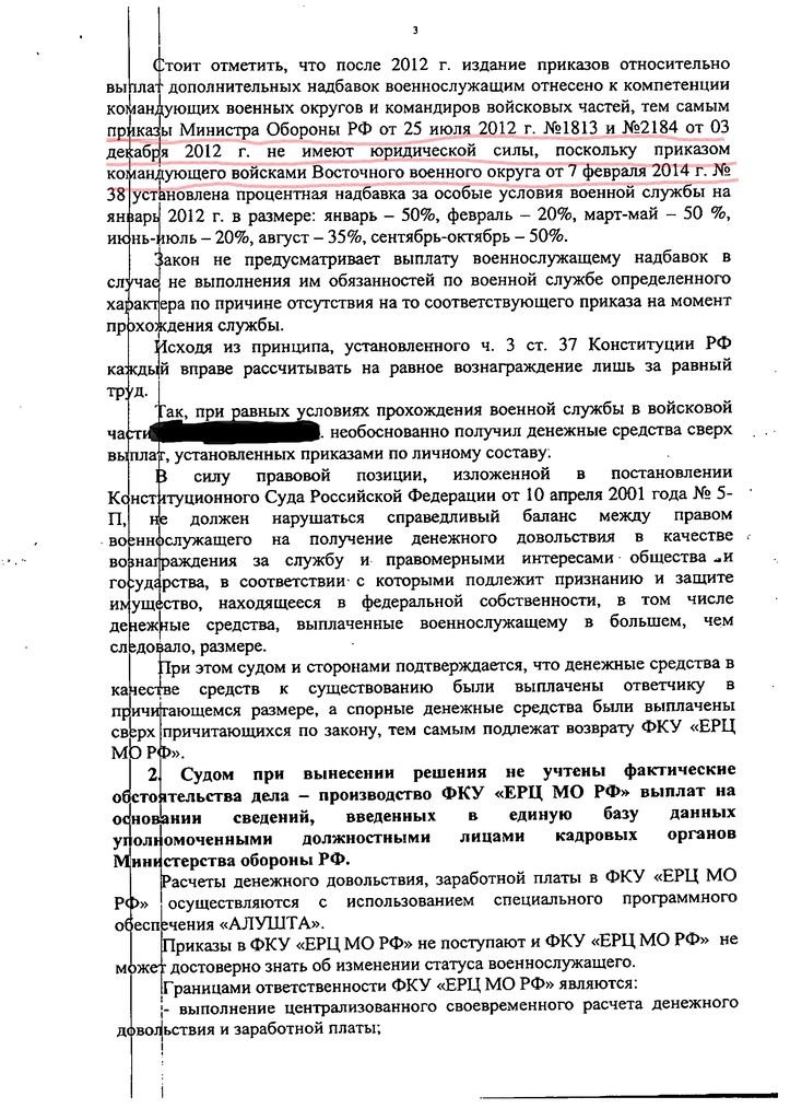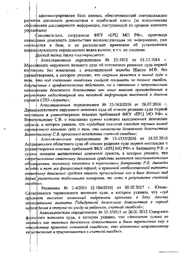 Согласно решения ГВС: «Что касается ст. 1109 ГК РФ предусматривающей, что пенсия, предоставленная гражданину в качестве средства к существованию, при отсутствии недобросовестности с его стороны и счетной ошибки возврату не подлежит, то здесь законодатель руководствуется невозвратностью сумм, полученных добросовестно и в качестве единственного средства к существованию. Поскольку с момента восстановления Федоренко С.В. были произведены все положенные выплаты по денежному довольствию за предыдущие 8 месяцев, то полученную выплату нельзя рассматривать по отношению к нему как единственное средство к существованию.