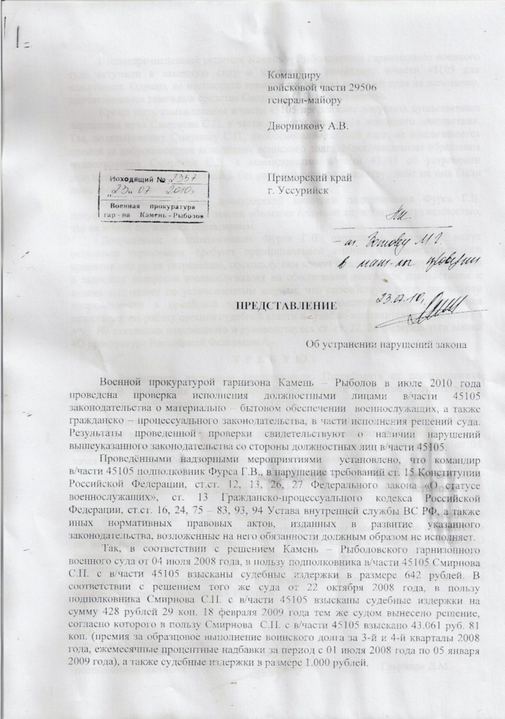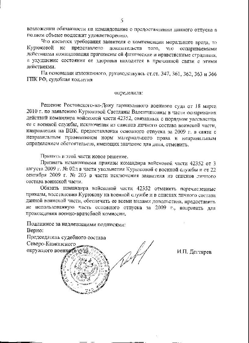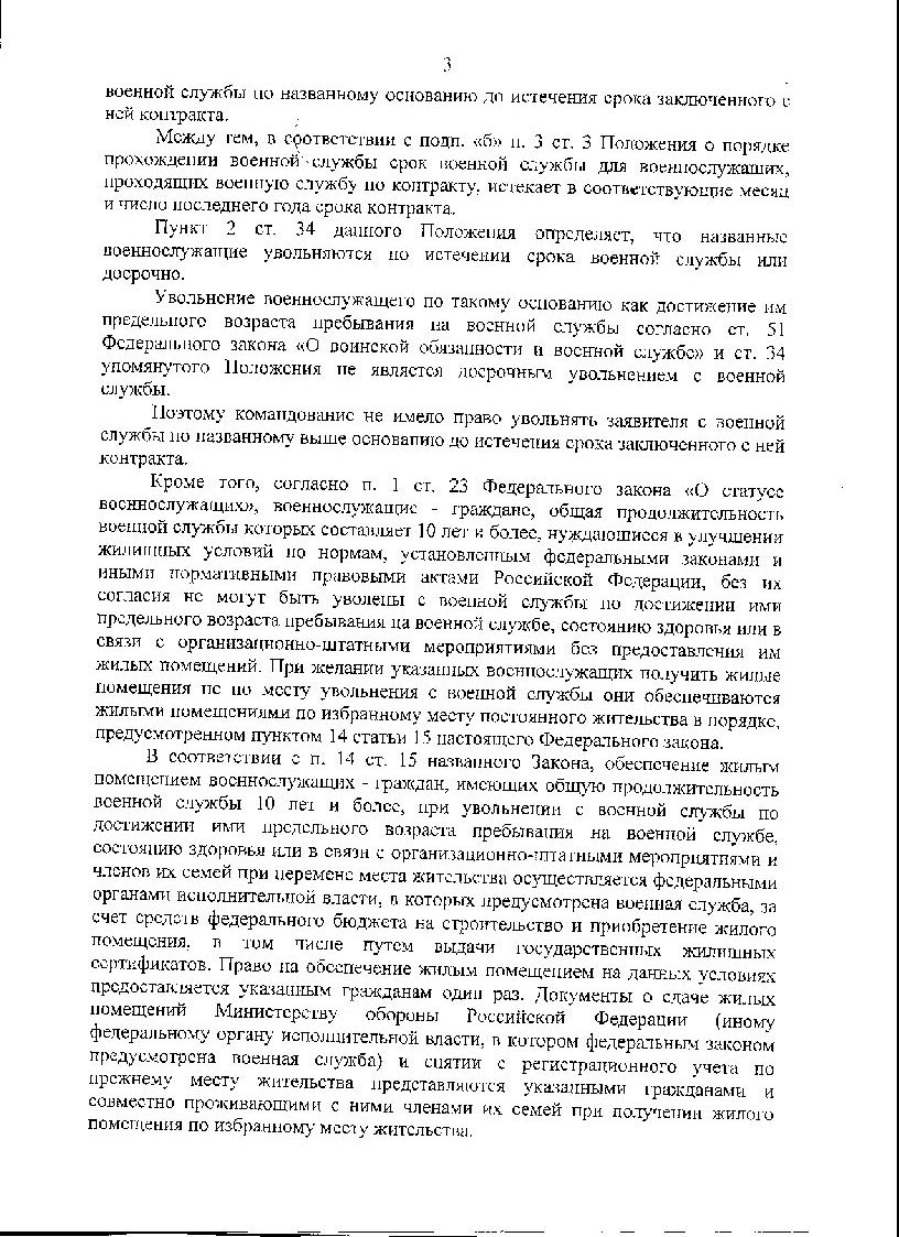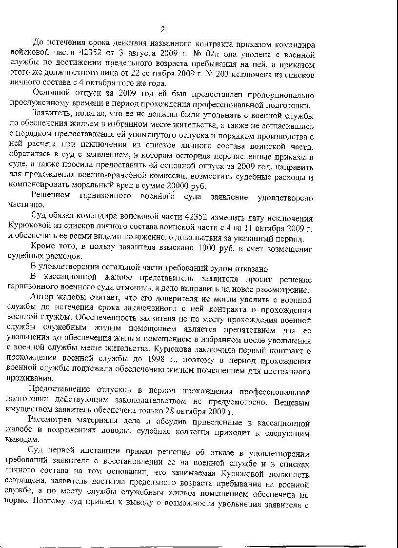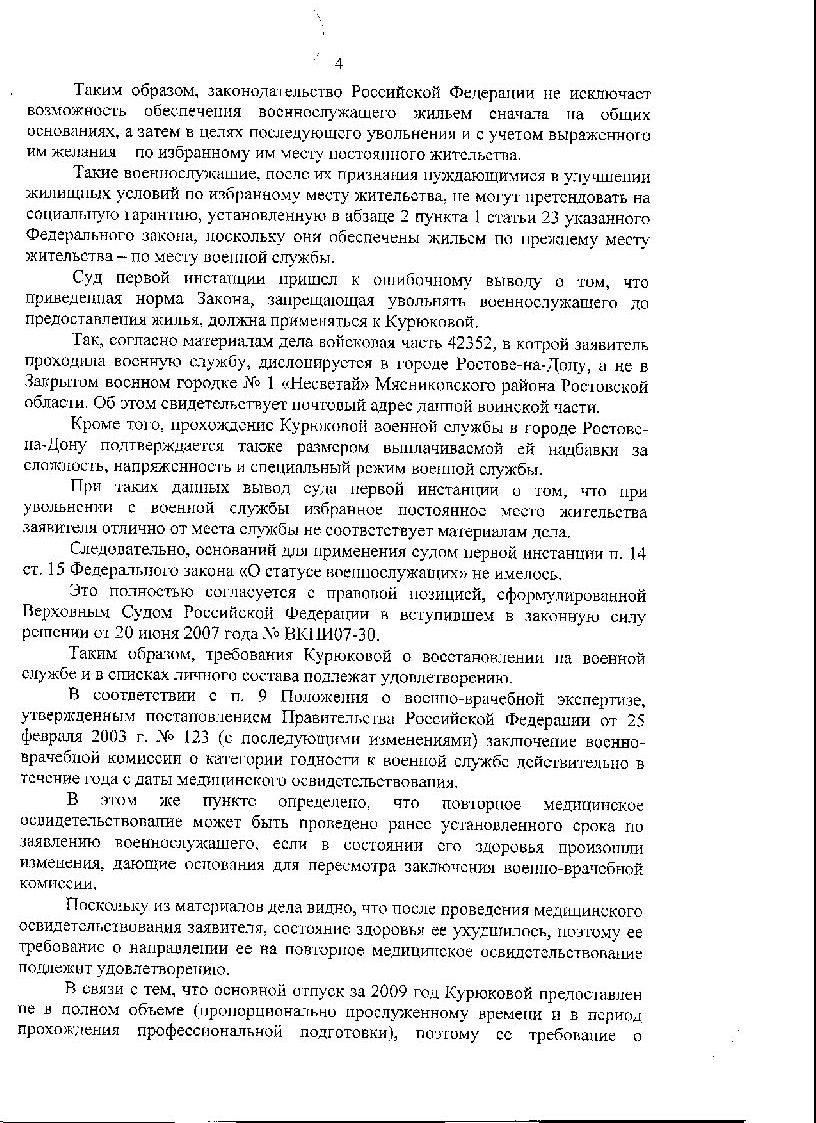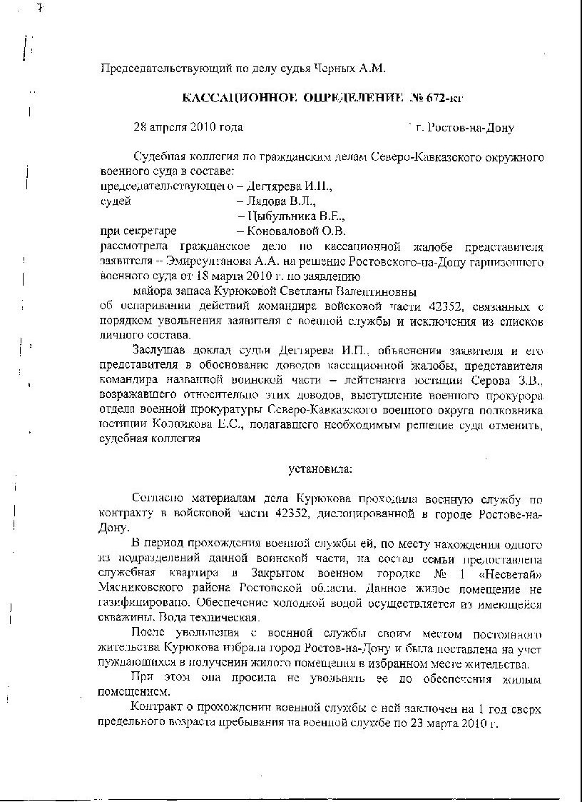 Спасибо за поздравления. Ситуация была сложная, не знаю можно ли считать это победой над ВКПИ07-30. Но то что меня хотели под это решение подвести- это точно. Дело в том, что у нас в части два подразделения. Управление находится в городе, а командный пункт в нескольких километрах от него, где я и служила. Но это одна и та же часть. В рапорте я просила жилье по месту службы, т.е в том городе где расположено управление. Командование , да и гарнизонный суд считали , что я по месту службы: в военном городке служебным жильем обеспечена по нормам (4 дома в степи без питьевой воды, каких либо магазинов, школ и т.п. до ближайшего населенного пункта 7 км), и прошу не по месту службы. На таких же основаниях после меня еще уволили несколько человек , но вот и они уже выиграли кассации. Решения я выложу, надо только разобраться, как это сделать здесь.