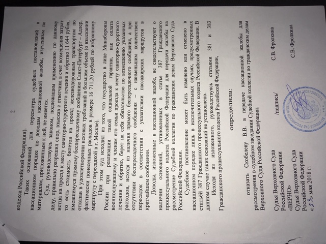 По определению суда, все дело оказывается в не предоставленной справки об отсутствии поездов прямого беспересадочного сообщения, а не в том, что я поехал в санаторий с пересадкой, из-за чего и возник спор, поэтому в рассмотрении жалобы отказано. В общем я им про Фому, они мне про Ерему… Комментарии излишни….