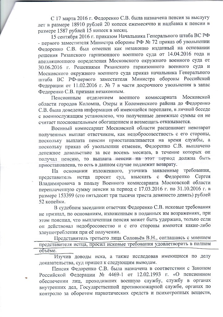 Командир части в свою очередь как настоящий Офицер, зная о том, что именно по его вине я был незаконно уволен из рядов ВС РФ, направил в суд своего представителя в качестве третьего лица (юрисконсульта) который поддержал в полном требования военного комиссариата о взыскании с меня якобы переплаченной пенсии. Данный факт установлен в суде. Чудеса ????