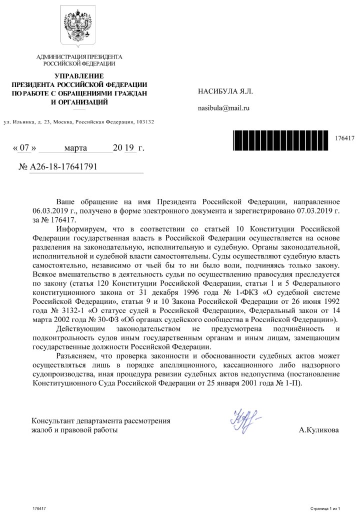 Сегодня мне пришел ответ из администрации Президента на мое обращение к Президенту. Полнейший беспредел. От имени Президента вопросы по нарушению Конституции решают какие то консультанты департамента рассмотрения жалоб и правовой работы. Направил письмо руководителю администрации Президента письмо с просьбой довести материалы до Президента.