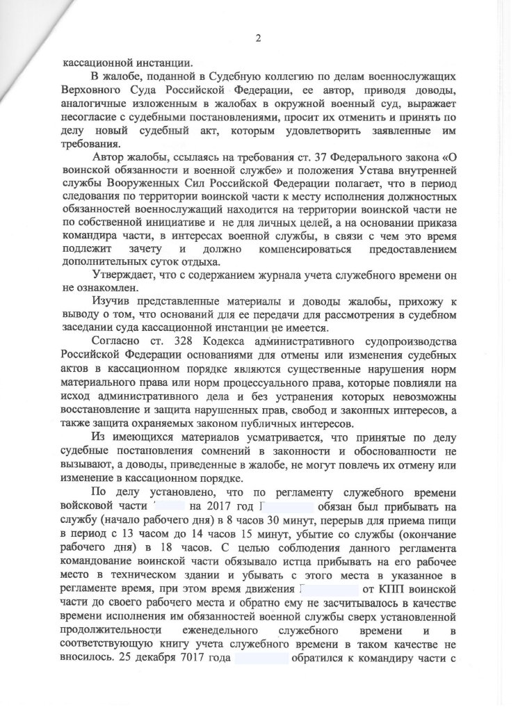 #3420Ждем кассацию по этому поводу. Ссылаемся на то, что так как истец не имеет право на предоставление времени для следования к месту проведения отпуска и обратно (суд признал, что отпуск "недодали", но принял решение о переносе, а не о восстановлении), а право выбора места проведения отпуска - это исключительная прерогатива самого военнослужащего, то суд не имеет возможности определить конкретное число положенных дополнительных суток на дорогу. Пока первая кассация только. Еще сослались на то, что ез восстановления нарушается право заявителя на льготный отдых в отпуске в санаториях МО РФ. Ждем.QR_BBPOST непредоставленным отдыхом - номер тухлый